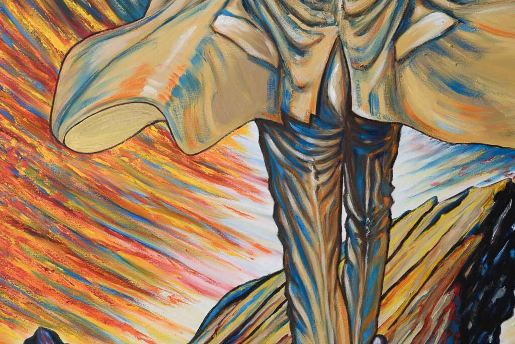 De witte bollen en kleurrijke stromen in de lucht symboliseren gedachten, impulsen en mogelijkheden. Ze komen op hem af als inspiratie, als leven dat zich aandient. Het expressief impressionistische kleurgebruik versterkt het gevoel van beweging en innerlijke transformatie.