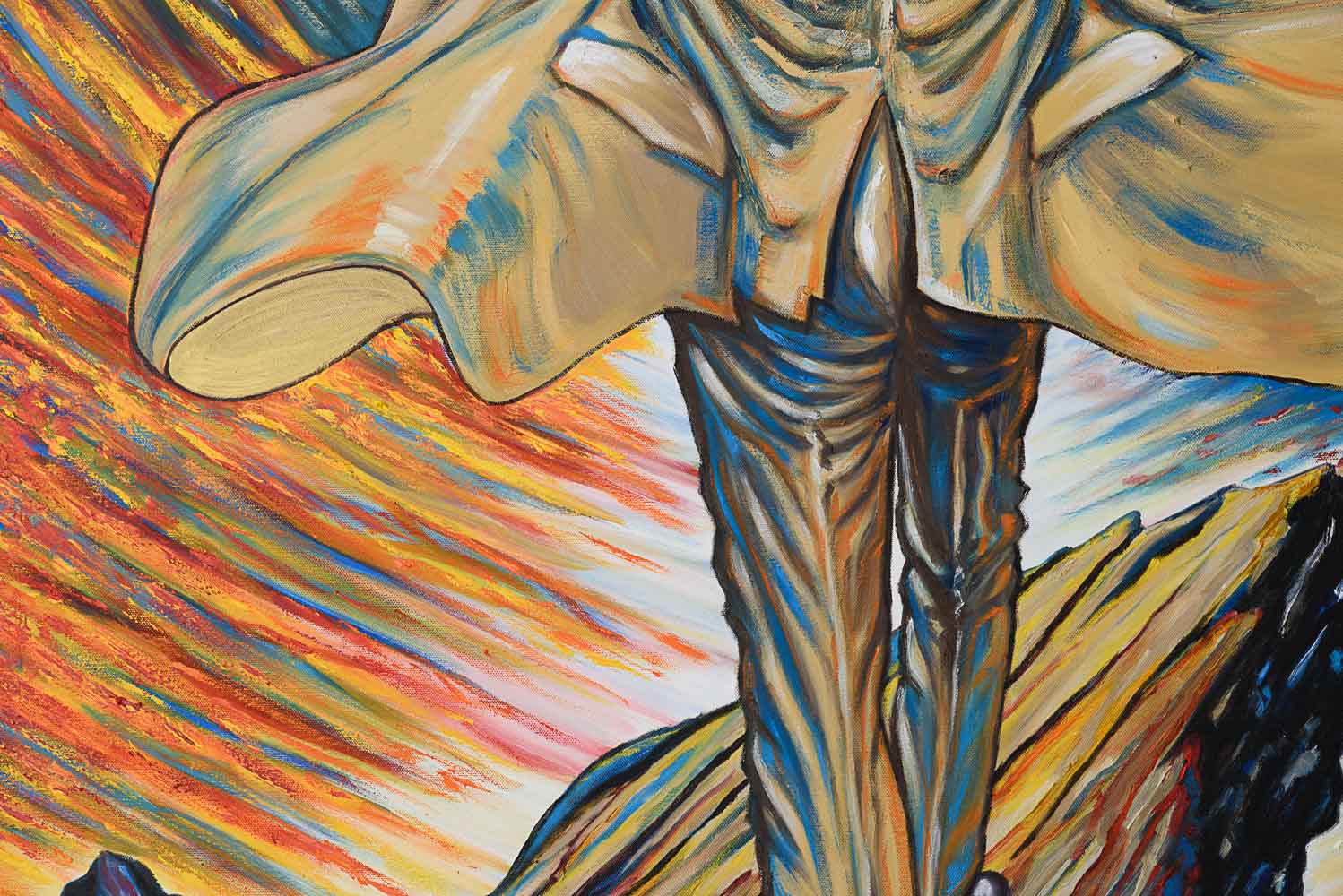 Er zijn momenten waarop alles samenkomt: het verleden, de keuzes van nu en de toekomst die zich opent. Man op bergtop verbeeldt dat kantelpunt. Een man staat met open armen op de scherpe rand van een bergtop, midden in een explosie van kleur, licht en energie. Zijn houding is krachtig én ontvankelijk — alsof hij alles achter zich laat en vol vertrouwen een nieuw begin omarmt.